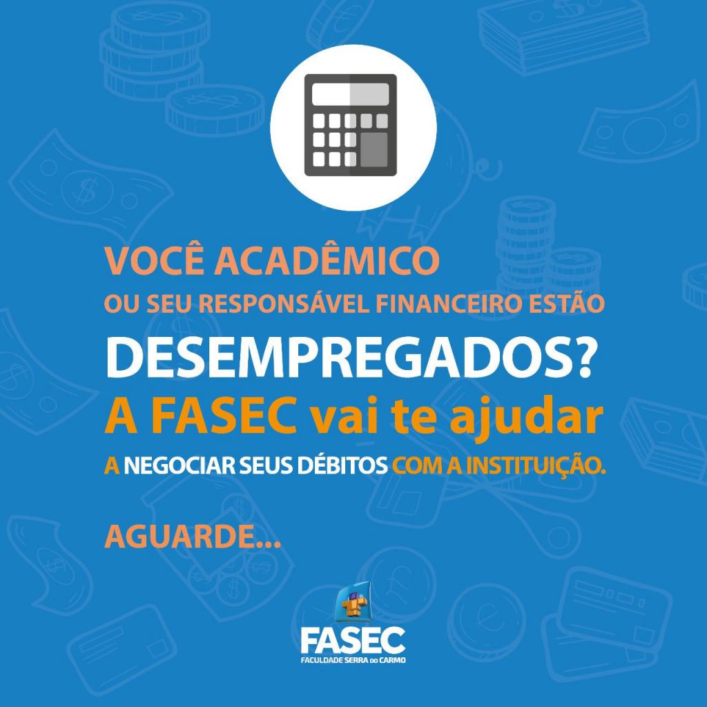Perdeu o emprego durante a pandemia? A Faculdade Serra do Carmo (FASEC) lança o Programa Especial de Financiamento Fasec (PEFF) para negociação de débitos 2019/2 e 2020/1, voltado para acadêmicos da instituição ou o responsável financeiro que tenham perdido o emprego durante a pandemia do coronavírus (Covid-19), iniciado em maio de 2020. A solicitação do financiamento pode ser realizada digitalmente pelo site da instituição, na aba “rematrículas online”: serradocarmo.edu.br.