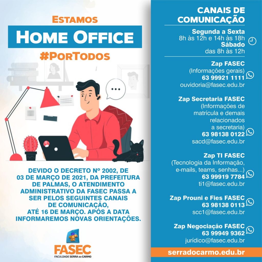 Devido o decreto nº 2002, de 03 de março de 2021, da Prefeitura de Palmas, e como forma de prevenção ao novo coronavírus, o atendimento administrativo da Faculdade Serra do Carmo (Fasec) passa a ser pelos canais de comunicação, até o dia 16 de março.