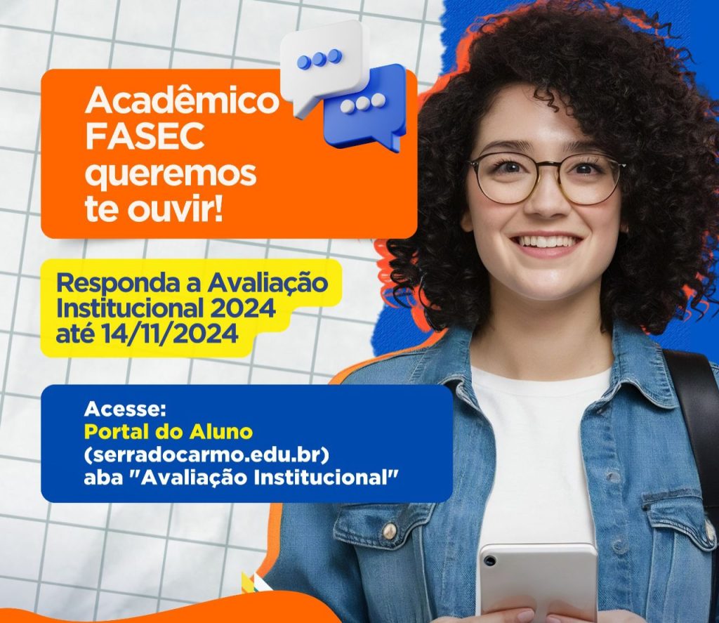 A Avaliação Institucional 2024 da Faculdade Serra do Carmo (FASEC) já está disponível, por meio de um questionário eletrônico, até o dia 14 de novembro no Portal do Aluno: portal.fasec.edu.br/aluno. A mesma é realizada pela Comissão Própria de Avaliação (CPA) e busca melhor avaliar a qualidade do ensino, dos setores administrativos, do pedagógico e até mesmo do funcionamento da estrutura da sede e anexos da instituição.