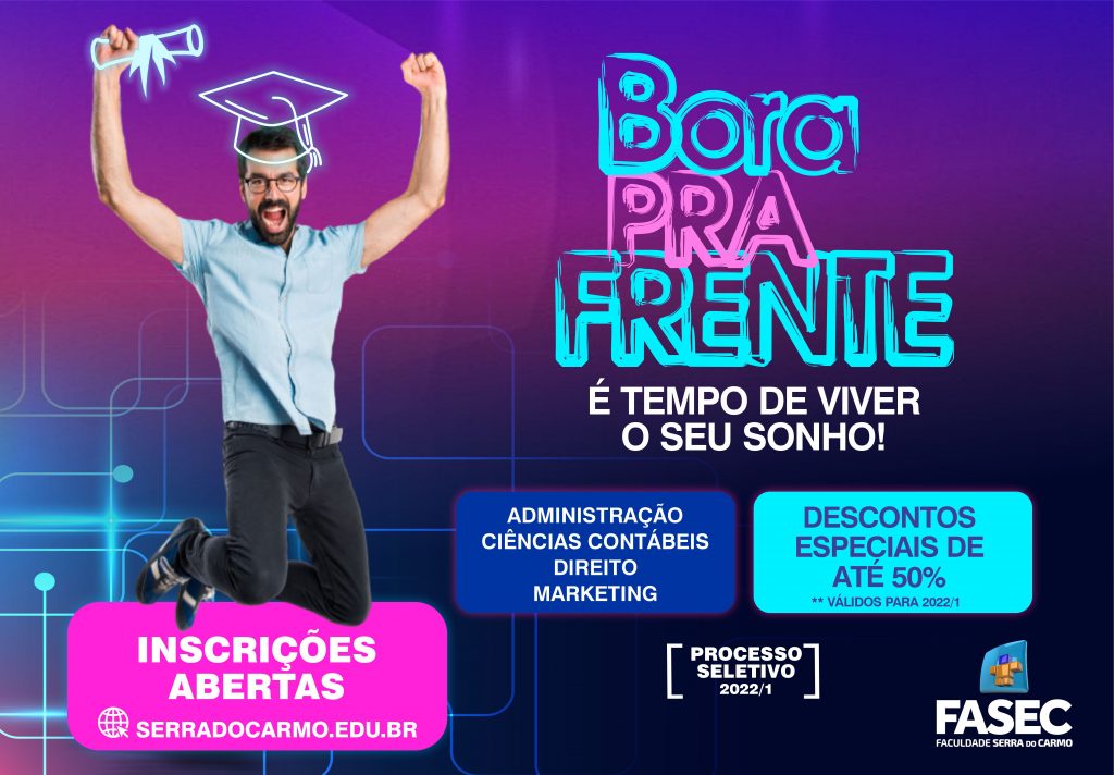 A FASEC – Faculdade Serra do Carmo está com inscrições abertas para o processo seletivo 2022/1 para os cursos de graduação em Administração, Ciências Contábeis, Direito e Marketing. Todos os procedimentos são 100% online: https://serradocarmo.edu.br/ e tem bolsas de até 50%.