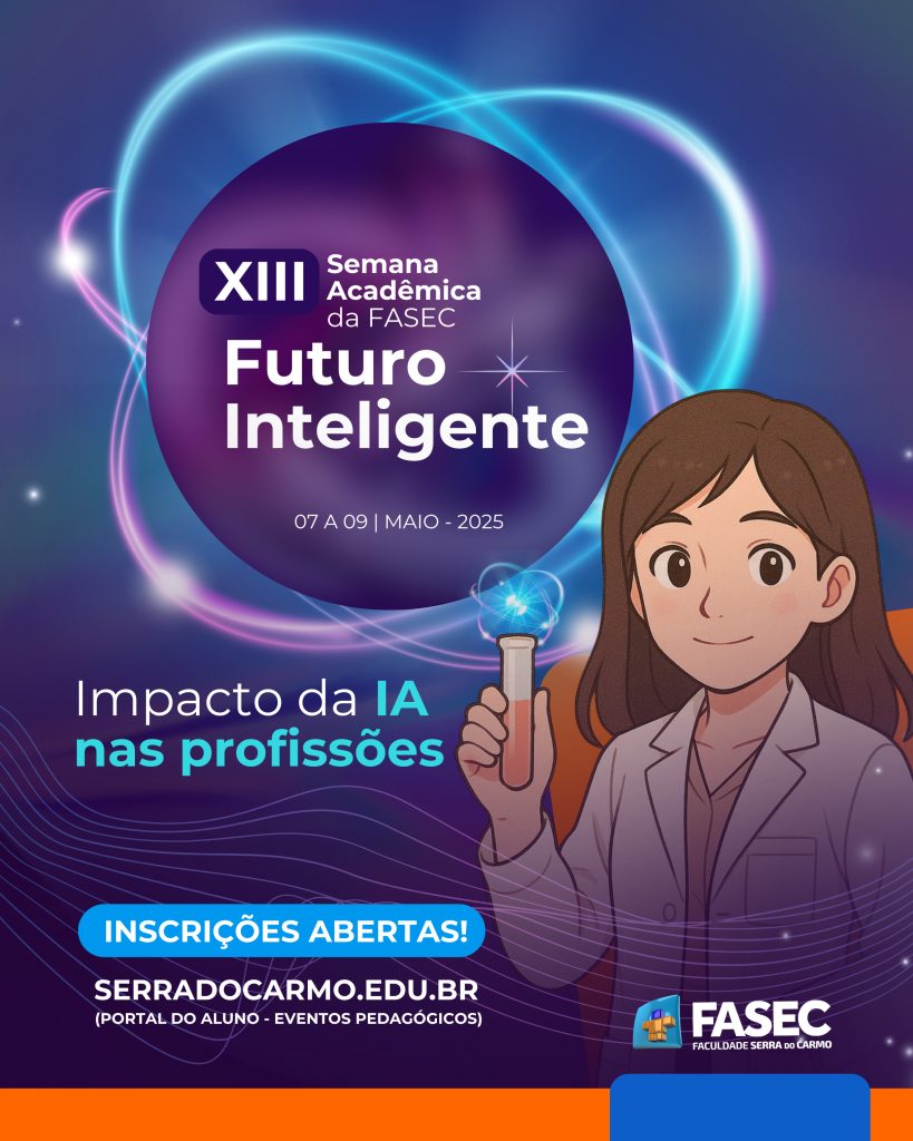 “Futuro Inteligente: explorando o impacto da IA nas profissões”. Esse é o tema da XIII Semana Acadêmica da Faculdade Serra do Carmo (FASEC) 2025, que está com as inscrições abertas até às 17h, do próximo dia 07 de maio. O evento acontecerá nos dias 7 a 9 de maio, com abertura oficial às 19h, no auditório da ATM, em Palmas.