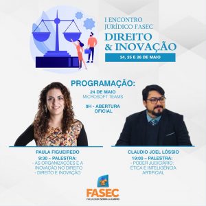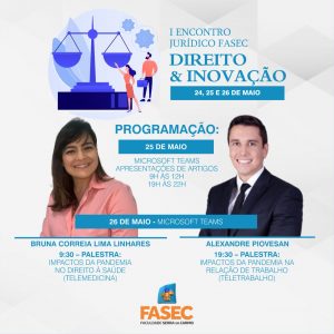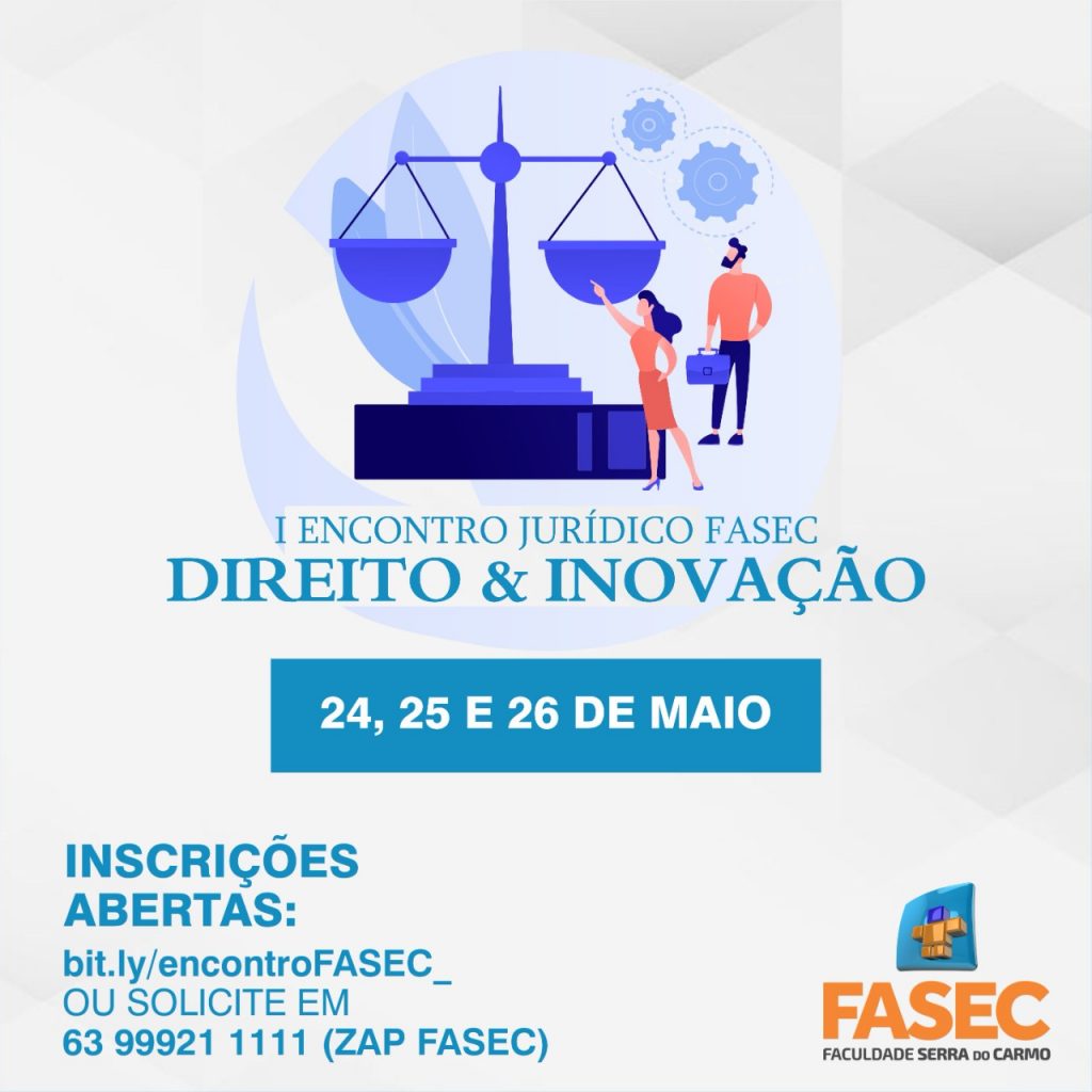 O curso de Direito da FASEC – Faculdade Serra do Carmo realiza o I Encontro Jurídico – Direito e Inovação, que acontecerá nos dias 24, 25 e 26 de maio. A abertura oficial será às 9h, e o evento acontecerá no Microsoft teams. Para participar o acadêmico precisa estar inscrito.