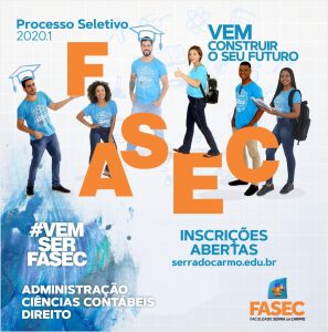 As inscrições estão abertas para o processo seletivo 2020/1 da FASEC para ingressar nos cursos de Administração, Ciências Contábeis e Direito. As inscrições são gratuitas, podendo ser realizadas presencialmente no atendimento da instituição, em Palmas.