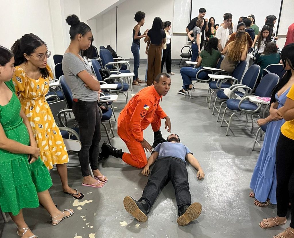 Uma aula diferente. Os acadêmicos do 1º período de Biomedicina, Enfermagem e Fisioterapia da Faculdade Serra do Carmo (FASEC) participaram de minicurso de primeiros socorros com simulações e práticas, ministrada pelo Soldado Huriel César França Azevedo. A ação aconteceu no último dia 23 novembro, na instituição, em Palmas.